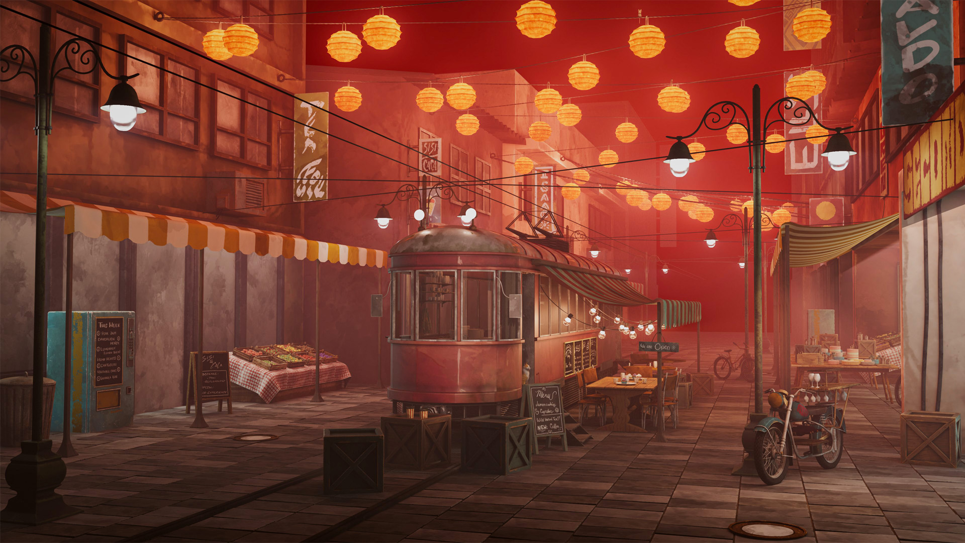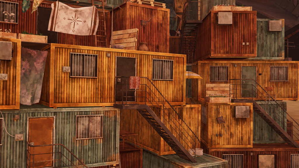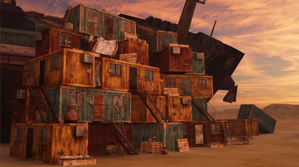 Right from the start of the project, it was clear that we wanted to take a step back from reality with a short film. Realistic assets are replaced by watercolour textures (made by Isabelle Posch) that contrast with the realistic proportions of the models. Thematically, “By and By” deals with one of the most present themes of our time: deceleration. Imagine people deciding to literally take a step back and only move around on foot, by bike or similar. Trains, cars, aeroplanes and ships come to a standstill. However, in the spirit of sustainability, the old vehicles are not simply scrapped, but recycled and remodelled into different living spaces. Far from a dystopia, our world represents an optimistic and peaceful vision of the future.