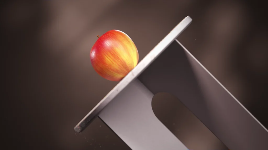 The apple then begins a journey through space, falling and rising again on the elevating plates, yet always stabilizing itself mid-motion. It then travels, falls, and repeatedly stabilizes in motion. In the final stage, the apple is reborn, completing its transformation. The lighting was carefully designed to ensure clarity and a polished, commercial appearance.